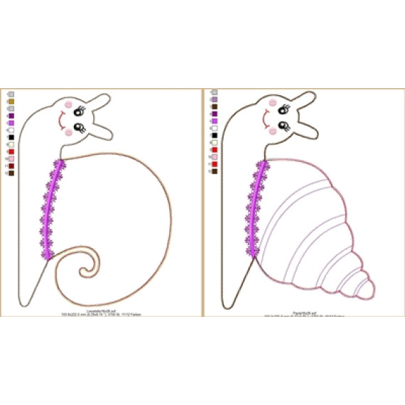 Digitale ITH "Schnecken Lieselotte + Paula 16x26", besteht aus 2 Stickmustern der Größen 16x26 cm in den Dateiformaten: jef, jef+, pes, exp, hus, dst, vip, vp3 und xxx.