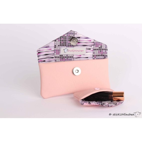 Die farblich abgesetzte Spitze des Täschchens ist ein besonderer Hingucker. Mit einem Magnetverschluss oder Kam Snap wird die Tasche verschlossen.