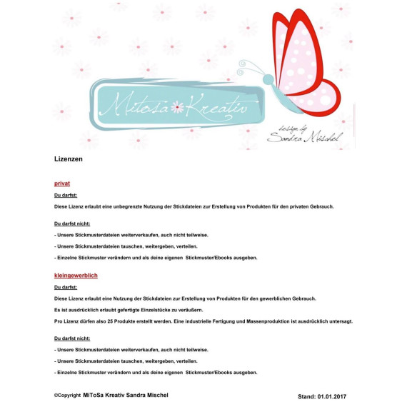 - Die Weitergabe einzeln gestickter Motive wie z.B. als Bügelmotive, Aufnäher, Applikationen etc. bedarf einer Genehmigung durch MiToSa-Kreativ.