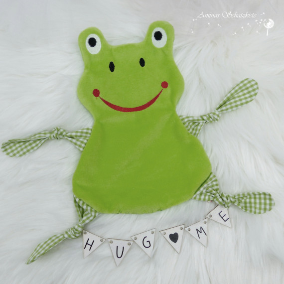 Hier kommt ein witziger Frosch als Kuscheltuch. Er ist ein treuer Begleiter und freut sich über Streicheleinheiten.