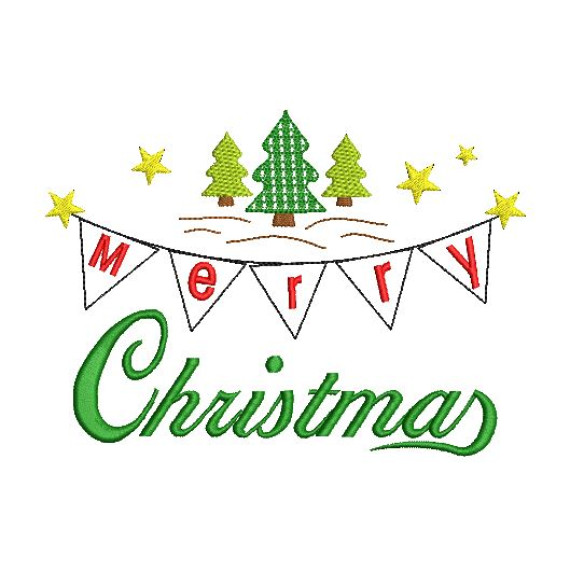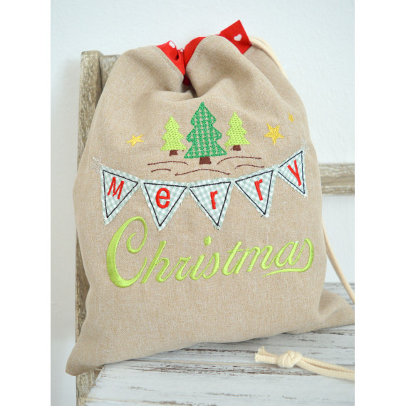 Stickdatei zu Weihnachten zum Aufpeppen und Dekorieren von Beutel, Kissen, Tascherl, Hüllen. Ein lieber Weihnachtsgruß gestickt. Die Wimpel werden im DOODLE/Fransenlook gestickt, der Rest erfolgt als Vollstick.