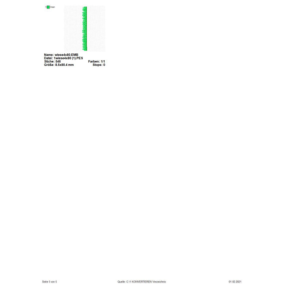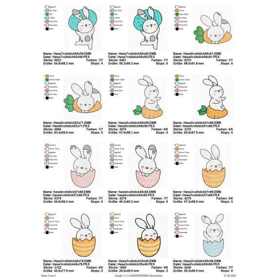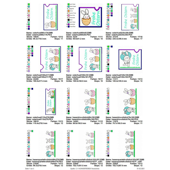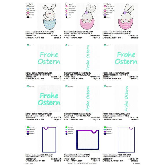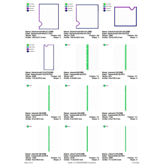 Die Abmessungen, Stichzahl und Farben der Stickdateien: