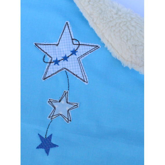 Die Sterne werden in Doodle-/Fransenoptik aufgestickt, die Stickmaschine hält nach jedem Stickgang, so können Sie eigene Farbkombis schaffen. Während des Stickens werden die Sterne einzeln mit Stoff unterlegt. Ergänzt durch Stickereien.