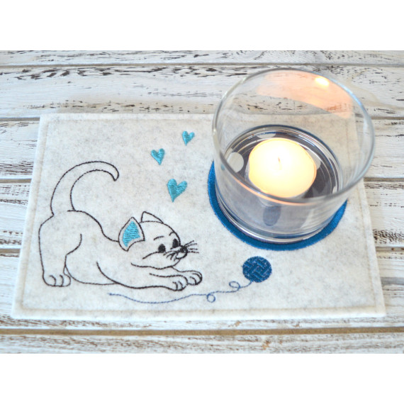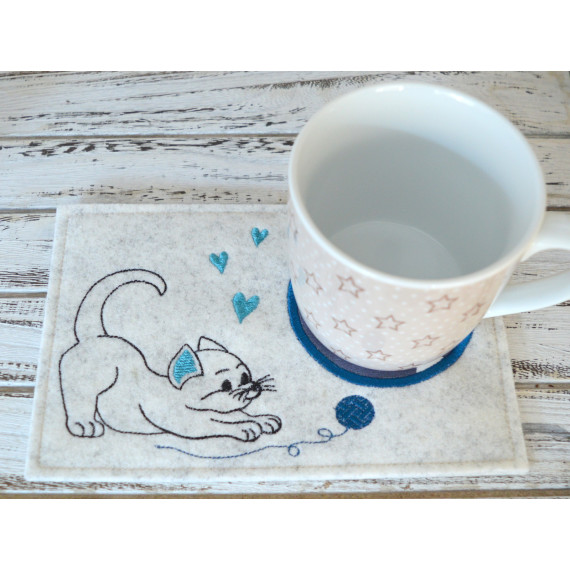 Stickdatei Mug Rug mit spielendem Kätzchen.