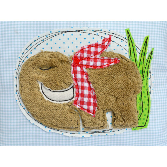 Durch Unterlegen (Buttons/Mammuts/Halstuch/Grashalmen) verschieden bunter Stoffe während des Stickvorganges erhaltet ihr ein süßes Mammut in Doodle-Optik (Fransen-Look), einfach überstehenden Stoff während des Stickvorganges abschneiden. Die Maschine hält nach jeder Farbe/Durchgang, so kann der Rahmen aus der Stickmaschine genommen werden, um den überstehenden Stoff abzuschneiden und neuen Stoff aufzulegen.