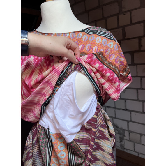 Das Stillkleid Erdbeere ist ein Sommerkleid, das oben locker geschnitten ist und überschnittene Ärmel hat. Das Vorderteil ist doppellagig. Die untere Lage ist der Stilleinsatz und wird aus dehnbarem Jersey genäht. Die obere Lage wird aus Außenstoff genäht und hat am unteren Ende ein Gummiband. So wird das diskrete Stillen ermöglicht. Soweit aber nicht gestillt wird, sieht das Kleid aus wie ein reguläres Sommerkleid.