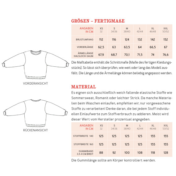 - Materialempfehlung: weich fallende elastische Stoffe wie Sommersweat, Romanit oder leichter Strick