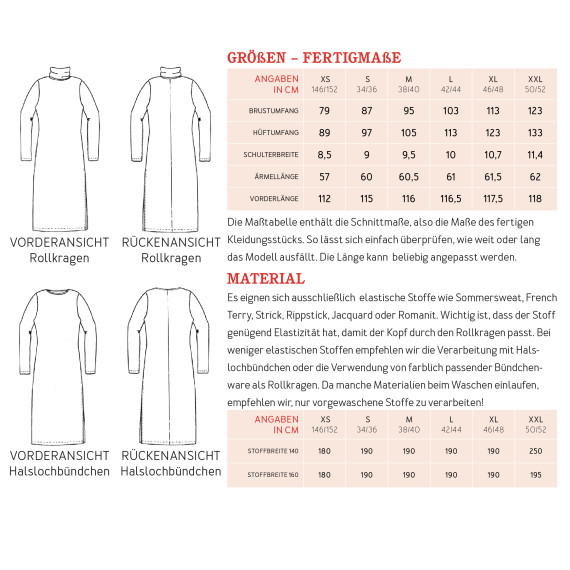 - Materialempfehlung: ausschließlich elastische Stoffe wie Sommersweat, French Terry, Strick, Rippstick, Jacquard oder Romanit.