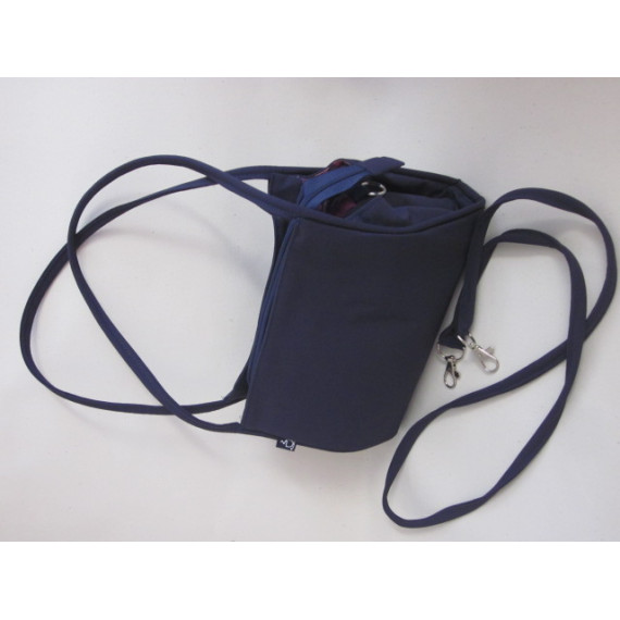 Besonders reizvoll sind gepaspelten kurzen Träger, die nahtlos in die Paspel-Einfassung der Seitenkanten übergehen. Seitlich kann zusätzlich noch ein langer Gurt (ebenfalls aus Paspelband) eingehängt werden, sodass die Tasche auch über die Schulter getragen werden kann.