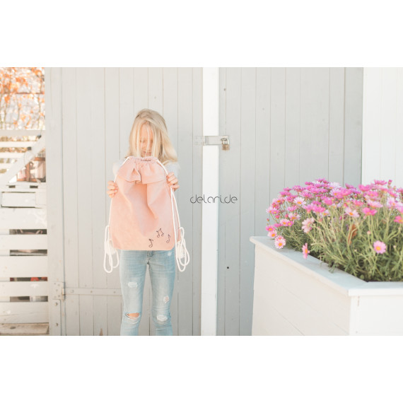 Du erhälst hier das Schnittmuster für *Turnbeutel mit Rüsche* von delari.de