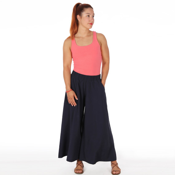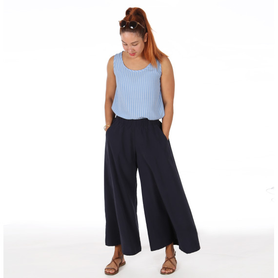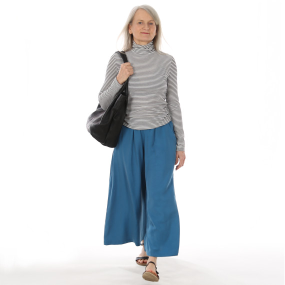 FRAU ORLA ist eine schwingende Hose, die fast wie ein Rock anmutet. Ihre extra weiten Beine garantieren maximale Bewegungsfreiheit und ein luftiges Gefühl bei hohen Temperaturen. FRAU ORLA hat abgerundete Eingriffstaschen und einen bequemen Gummibund.