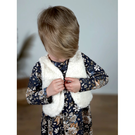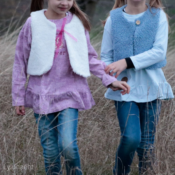 Die Weste ist für kuschelige Stoffe wie Plüsch, Teddy oder Fleece als Außenstoff ausgelegt und als Futter empfehlen sich gewebte Stoffe wie Popeline, Satin oder ähnliches.