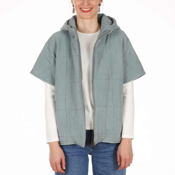Die Steppweste FRAU KYRA vereint gemütlichen Komfort mit modernem Design. Mit ihren kurzen, angeschnittenenÄrmeln hält sie dich wunderbar warm, ohne einzuengen. Die doppellagige Kapuze schützt zuverlässig vorWind und Kälte, während der praktische Reißverschluss für bequemes An- und Ausziehen sorgt.Innen ist die Weste ungefüttert und wird mit Beleg verarbeitet – so bleibt sie leicht, anschmiegsam und perfektfür den Übergang. Alle Kanten werden, für einen lässigen Look, mit Schrägband eingefasst. Ob sportlich zurJeans oder über einem Kleid kombiniert: FRAU KYRA ist ein echtes Must-have für kühle Tage.