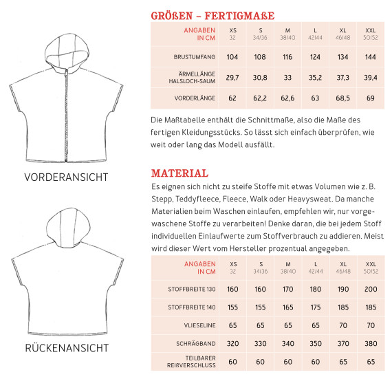 - Materialempfehlung: nicht zu steife Stoffe mit etwas Volumen wie z. B. Stepp, Teddyfleece, Fleece, Walk oder Heavysweat