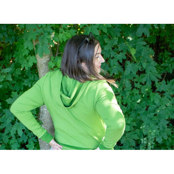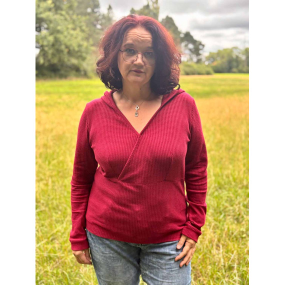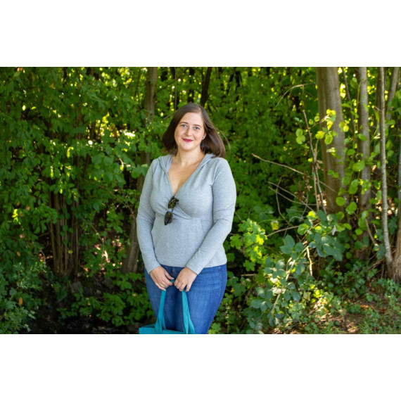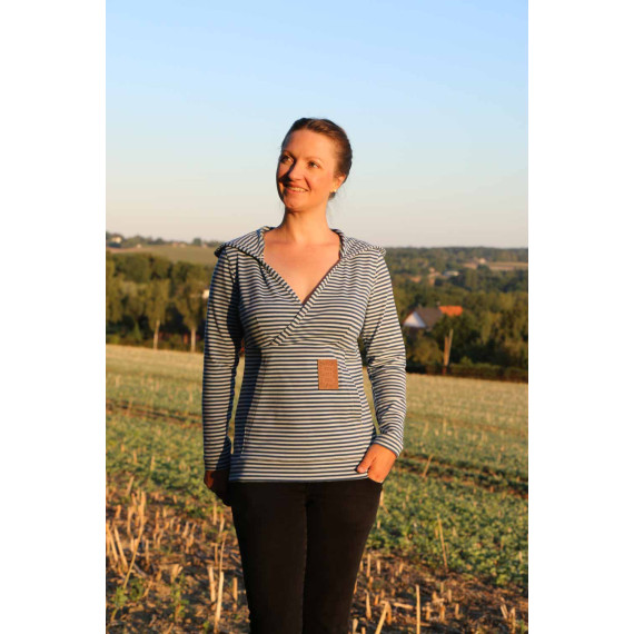 Zusammengefasst: Dieser Schnitt bietet dir ein figurbetontes Kapuzenshirt mit eingefasstem V-Ausschnitt, Brustabnähern und Unterbrustteilung, sowie der Möglichkeit einer optionalen Bauchtasche und Bündchenabschluss für einen sportlicheren Look, als auch einer feminineren, feineren und gesäumten Variante, die kurz über der Hüfte endet.