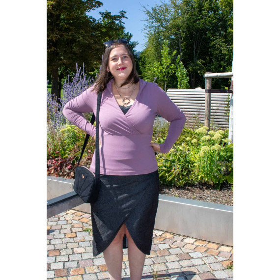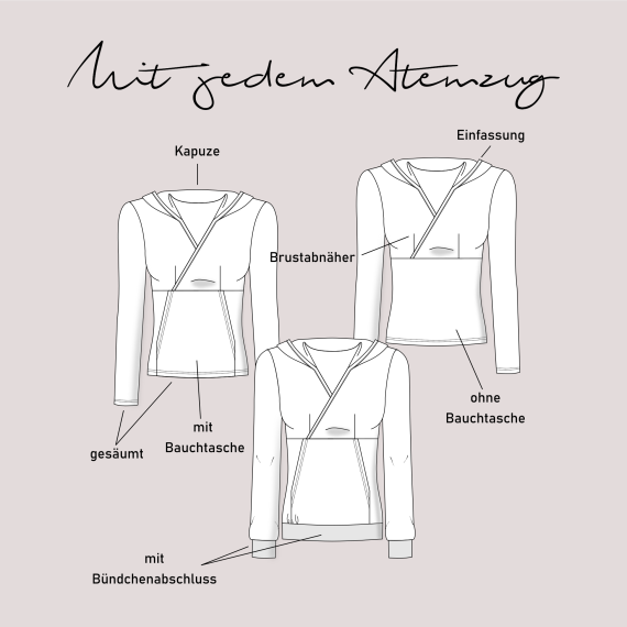 Es gab dieses Jahr Momente, in denen mir der Atem stockte. Zeiten voller Fragen, Entscheidungen und Umbrüche. Und dann gab es diese anderen Augenblicke – ganz leise, fast unscheinbar, in denen ein tiefer Atemzug gereicht hat, um den Blick wieder zu fokussieren, den nächsten Schritt zu gehen, weiterzumachen. „Mit jedem Atemzug“ ist ein Schnittmuster für genau solche Momente. Es steht für Leichtigkeit, Wandel und innere Stärke – ganz gleich, ob sportlich mit Bauchtasche und Bündchen oder in einer ruhigen, feminineren Variante ohne Bauchtasche, fein gesäumt.