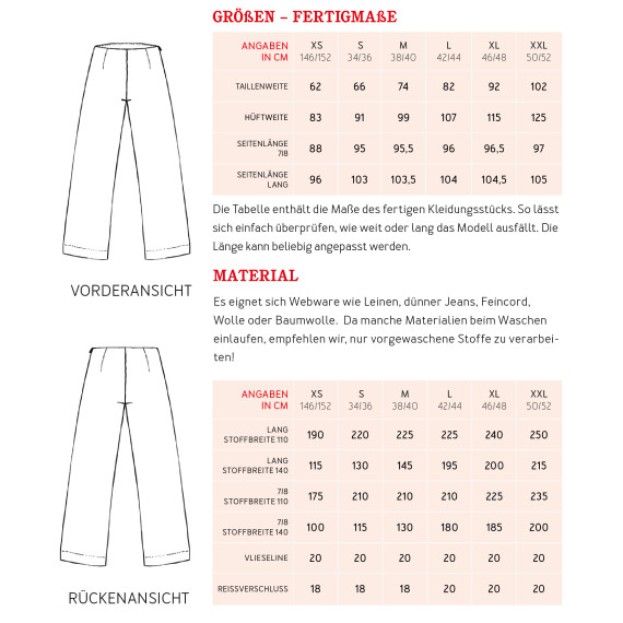 - Materialempfehlung: nicht zu steife Webware aus Leinen, dünnem Jeans, Feincord, Wolle, Baumwolle oder ähnlichem.