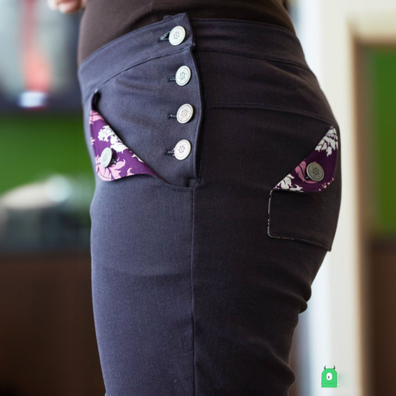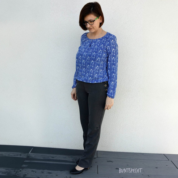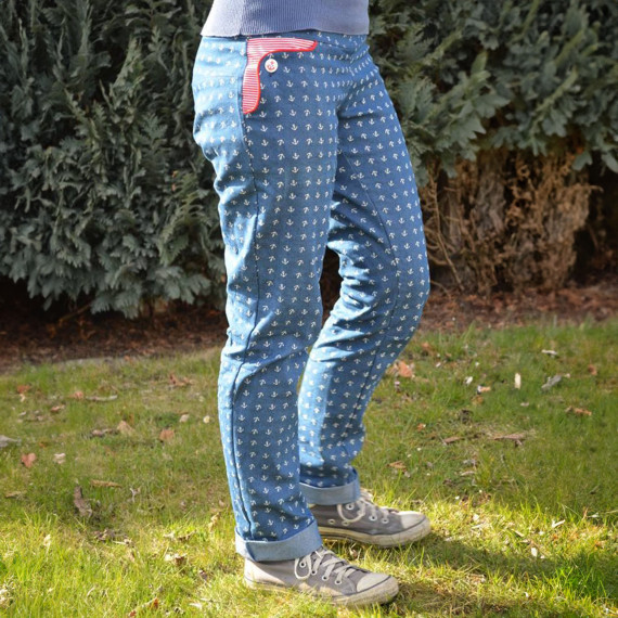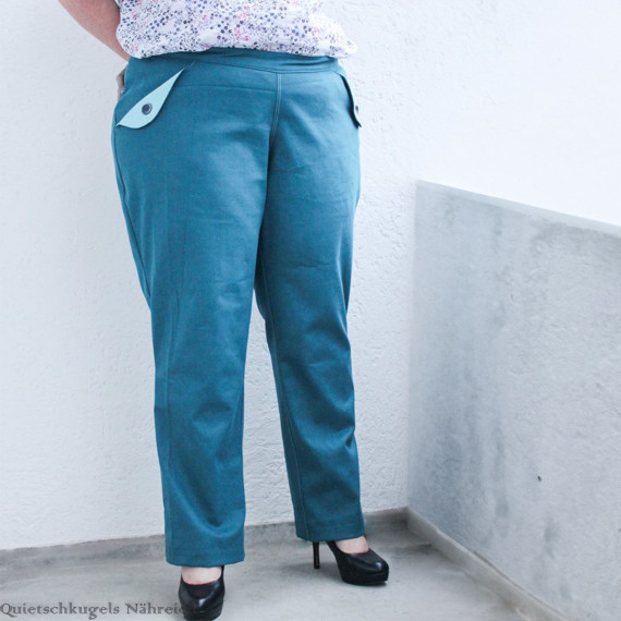Die Hose Saila wird durch einen seitlichen Knopfverschluss geschlossen, der schnell und einfach zu nähen ist. Aufgepeppt wird das Ganze durch eine geschwungene Vordertasche mit Zierknopf sowie aufgesetzten Popstaschen.