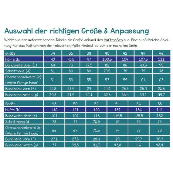 Bei sehr dehnbarem Material kann eine Größe kleiner gewählt werden. Wie ihr euch exakt vermesst und euer Material testet, ist im eBook mit Fotos beschrieben.