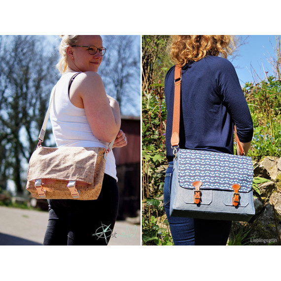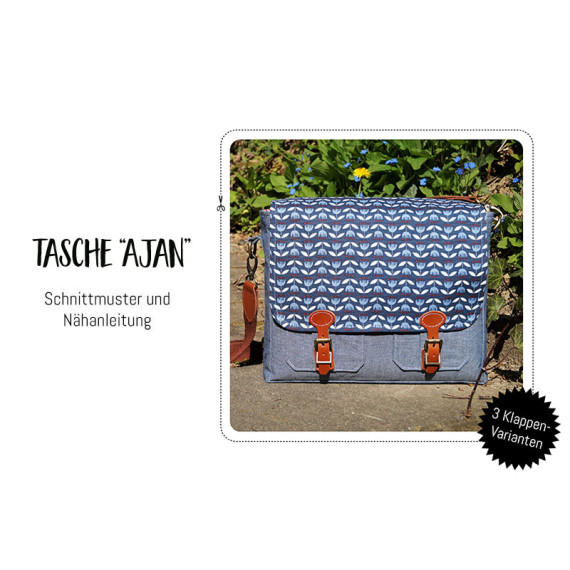 Die Umhängetasche Ajan ist dein idealer Begleiter für die Uni, im Büro oder zum Einkaufen. Durch die Reißverschlusstasche auf der Rückseite und in der Innentasche kannst du wichtige Dinge sicher verstauen. Die Tasche ist sehr geräumig und durch die aufgesetzten Außentaschen hast du noch viel mehr Verstaumöglichkeiten. Die Träger sind längenverstellbar, sodass du die Tasche perfekt auf deine Bedürfnisse anpassen kannst. Im Schnittmuster kannst du aus drei verschiedenen Klappenformen wählen: gerade Kanten, abgerundete Ecken oder abgeschrägte Klappe. Die aufgesetzten Taschen lassen sich aus Baumwollstoff oder aus nicht fransendem Stoff nähen. Auch bei den Trägern hast du die Wahl und kannst sie entweder aus Gurtband oder aus nicht fransendem Stoff mit Buchschrauben nähen. Alle Varianten und Möglichkeiten sind im Schnittmuster enthalten und werden genau erklärt.