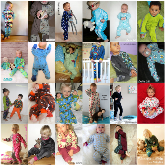 Winterschlaffein ist ein bequemer Schlafanzug mit überlappender Knopfleiste. Für Windelkinder ist eine Option mit Knopfleiste im Innenbeinbereich integriert. Optional können Füßlinge und Handschuhe fest oder zum Umklappen angenäht werden – so vermeidet man kalte Füße und Hände sowie Kratzen.