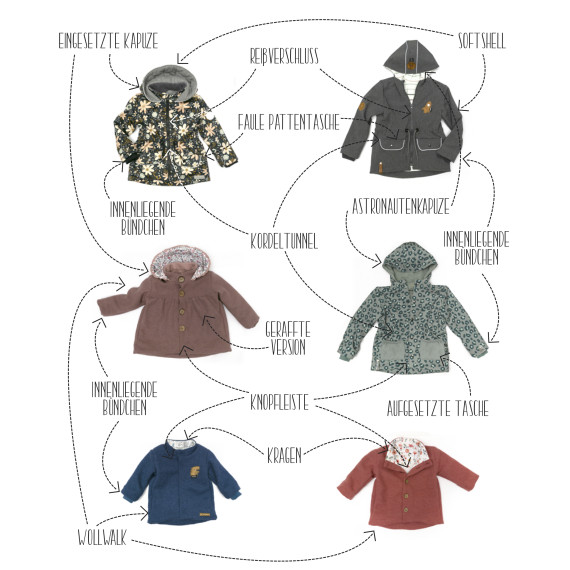 Die Allwetterjacke kann als gerade Jacke oder geraffter Mantel für Mädchen und Jungs genäht werden. Durch unterschiedliche Variationsmöglichkeiten wird jede Jacke ein individueller Begleiter bei jedem Wetter. Du hast die Wahl zwischen Knopfleiste und Reißverschluss, zwei verschiedenen Kapuzen und einem Kragen, unterschiedliche Taschen und einem Kordelzug. Die Jacke ist perfekt geeignet für Walk und Softshell.