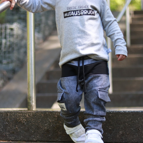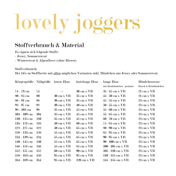 lovely joggers ist eine locker geschnittene Hose, die Kinder (Größe 74–164) über das ganze Jahr tragen können. Sie kann in 3 verschiedenen Längen, 2 Weiten und aus unterschiedlichen Stoffarten genäht werden.