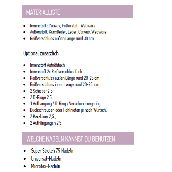Die Maxi-Bennibag ist ein Crossbag und besteht aus 2 Außenteilen, 2Innenteilen und Schulterriemen. Sie ist mit einem Reißverschlussschließbar. Optional wird dir im Ebook eine Taschenfütterung mit Reißverschlussfach, Trennfach, Aufnähfach und weiterenSchulterriemen- und Aufhängungsvarianten erklärt. Du kannst die Bennibag aus Kunstleder, Canvas oder Webware nähen. DieNahtzugaben sind bereits enthalten und Fadenläufe sowie Brüche sindmarkiert. Mit den Maßen